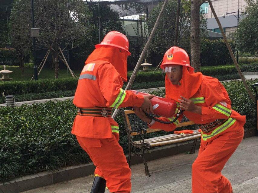 第一天首先進行的是商管組。商管組比賽內(nèi)容是4*100米接力滅火操作及二人二盤水袋連接出水操作。4*100米接力滅火比賽規(guī)則為第一名參賽隊員聽到預(yù)備口令時,在起點線做好起跑準(zhǔn)備,另外3名隊員分別在100米處和起點線做好交接準(zhǔn)備,輔助人員將油盆的火點燃。聽到起跑信號,第一名隊員立即拿起滅火器向前跑(第一次搶跑重跑,第二次再搶跑的不記取成績),到100米處將滅火器交給第二名隊員,其他隊員以此類推。第四名隊員攜帶滅火器跑至油盆區(qū),利用滅火器將油盆的火撲滅后沖出終點線。二人二盤水袋比賽規(guī)則為連接出水操作聽到“開始”的口令或信號,第一名隊員先甩開第一盤水帶,將一端接口交給第二名隊員,第二名隊員將水帶連接在分水器上,做好出水準(zhǔn)備;第一名隊員攜帶水帶另一端和另一盤水帶向射水線跑動,在跑動過程中將第一盤的水帶接口與第二盤水帶進行連接并鋪設(shè)好第二盤水帶,動作完成后連接好水槍在射水線做好打靶準(zhǔn)備,然后示意第一名隊員出水,待水槍出水后將靶打到。