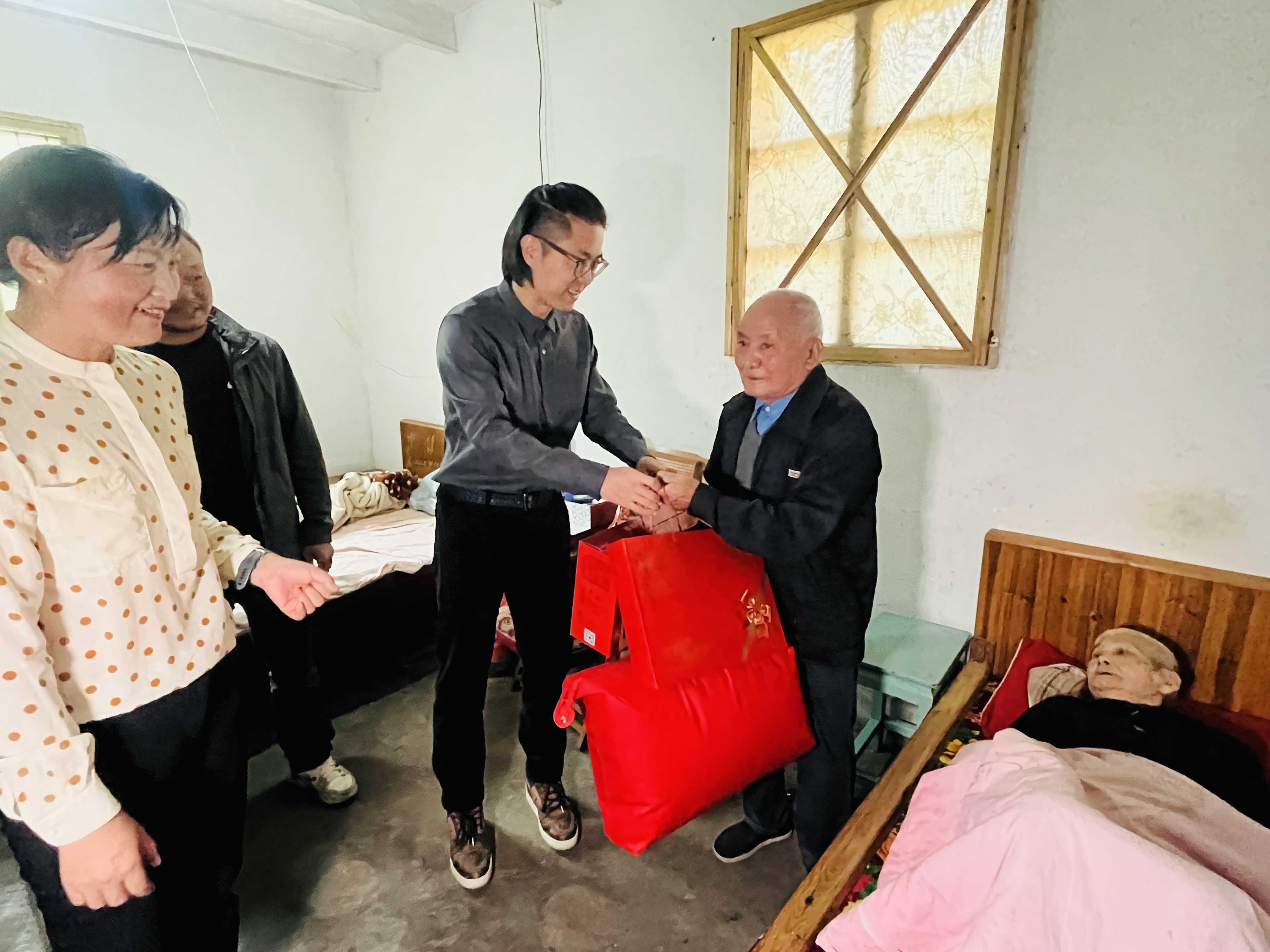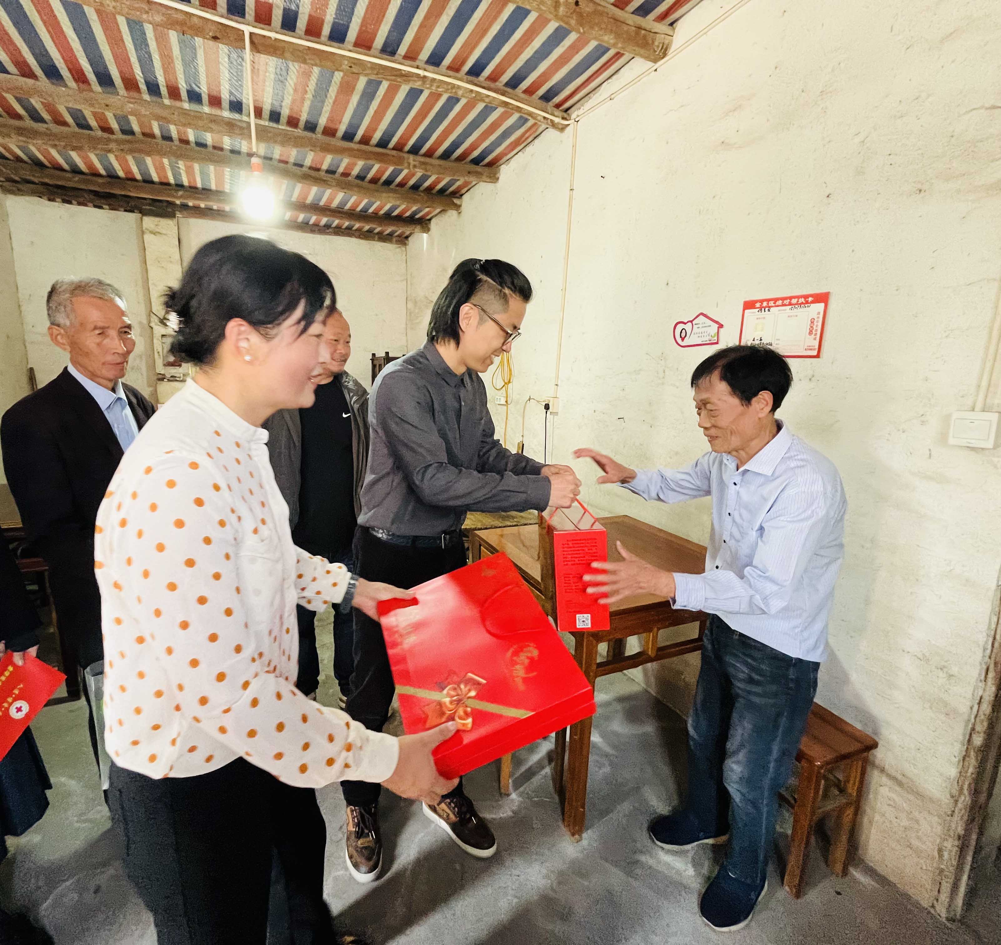 “重陽節(jié)快樂,祝你們健康長壽!”在村領(lǐng)導(dǎo)的陪同下,蔣晨虹董事長、傅融總裁一行走訪了村里的困難家庭,為他們送上慰問金及食物、被子、洗浴用品等生活物資,并與他們親切交談,關(guān)心詢問他們的身體狀況和生活情況。這不僅讓困難家庭感受到了社會(huì)的溫暖和關(guān)懷,也進(jìn)一步體現(xiàn)了金廈對(duì)弱勢(shì)群體的關(guān)注和支持。